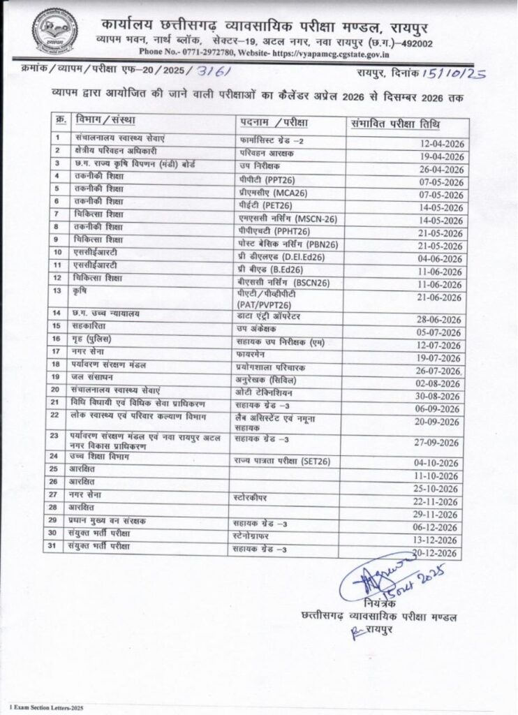 Cg vyapam exam calender 2026